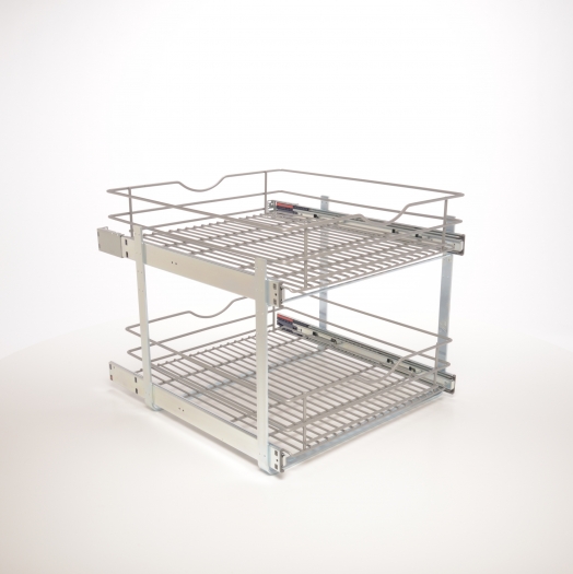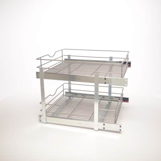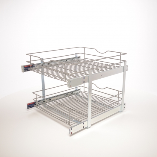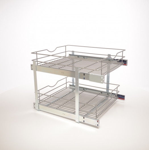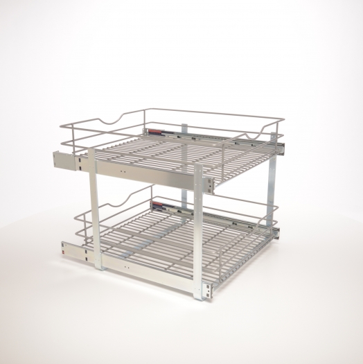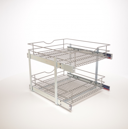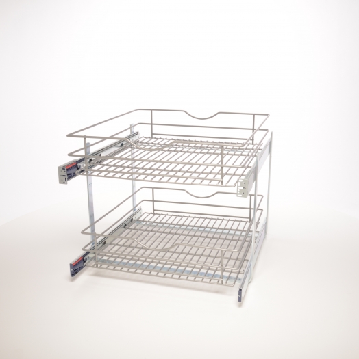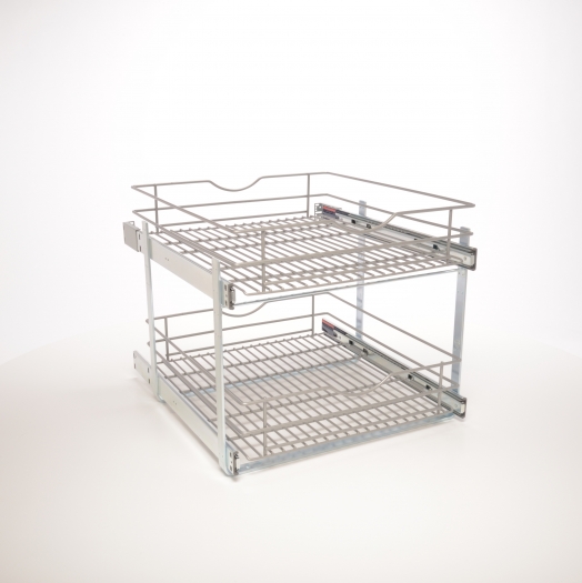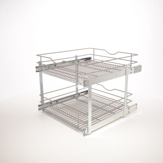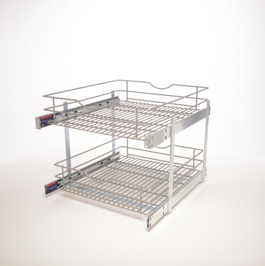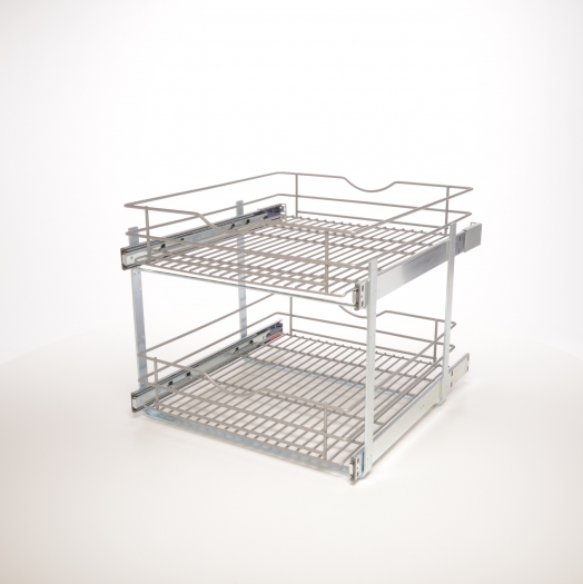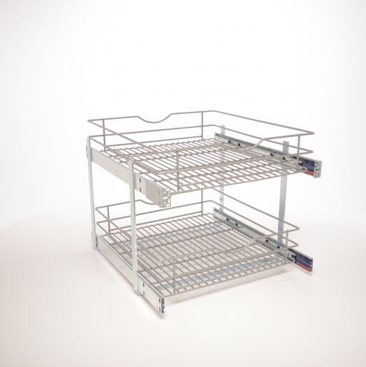 Calm the chaos in your kitchen, bathroom or laundry with our double-tier pullout cabinet organizer. This simple weeknight project is quick and easy to install. Dual baskets open smoothly and close softly. Top basket adjusts up or down; both baskets slide separately for easy access. Ideal for craft storage, pots and pans, more. Works best with our Door Mounting Kit, sold separately.