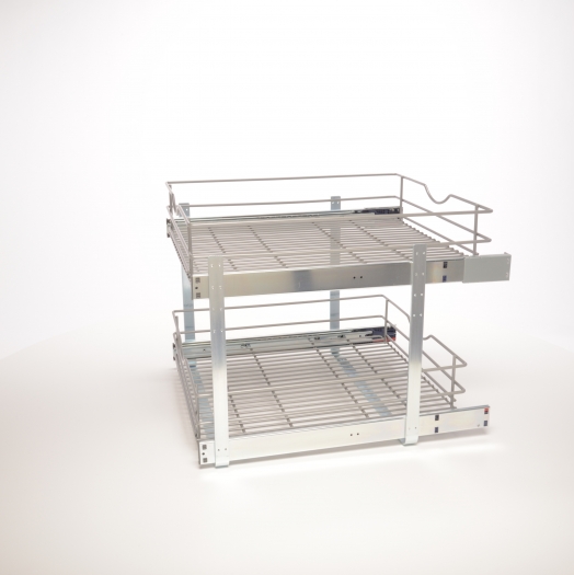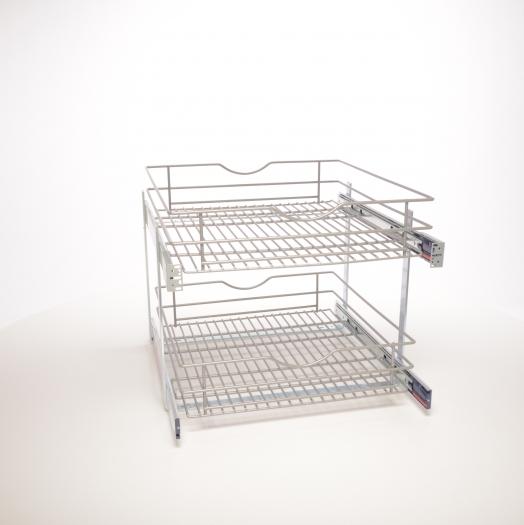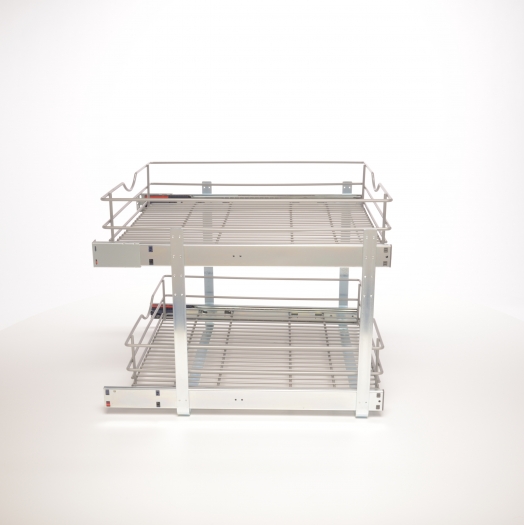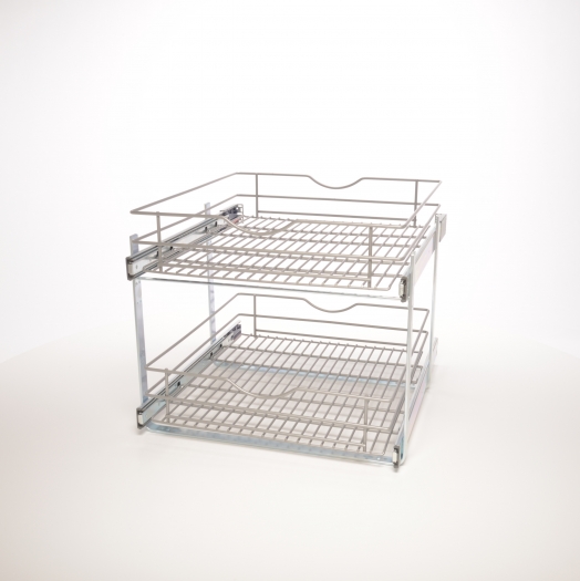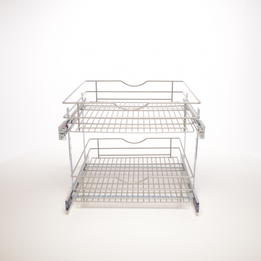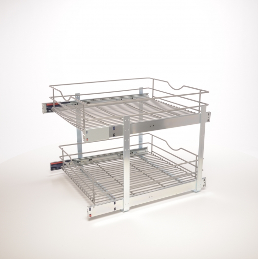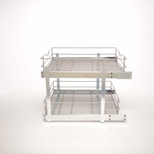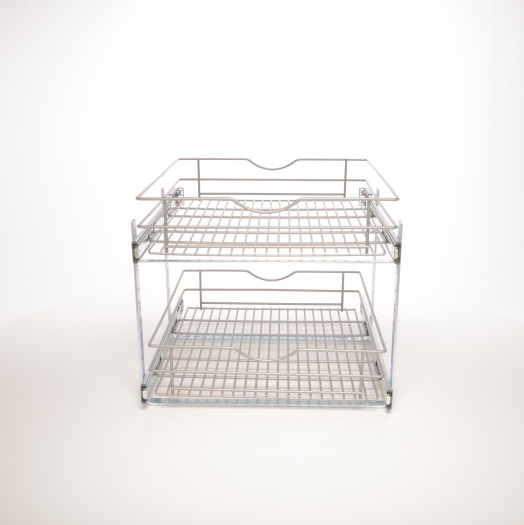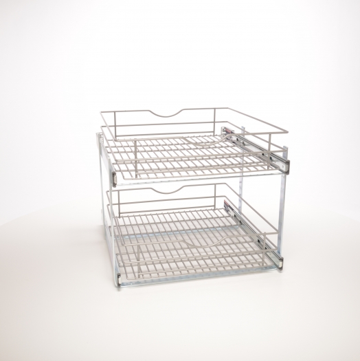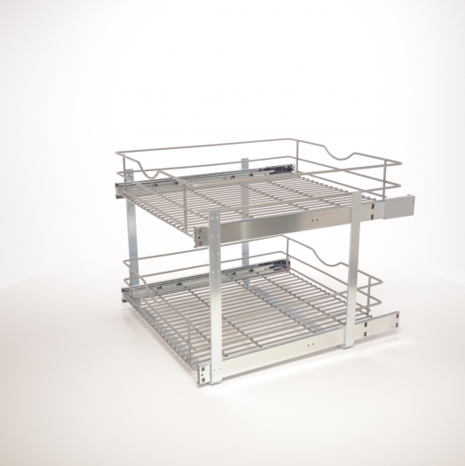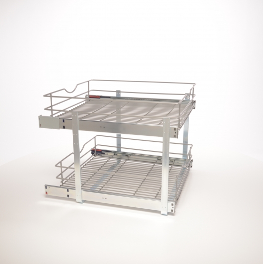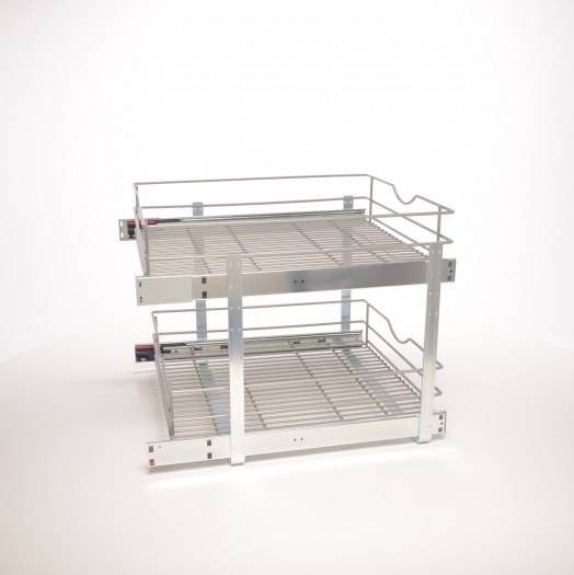 Calm the chaos in your kitchen, bathroom or laundry with our double-tier pullout cabinet organizer. This simple weeknight project is quick and easy to install. Dual baskets open smoothly and close softly. Top basket adjusts up or down; both baskets slide separately for easy access. Ideal for craft storage, pots and pans, more. Works best with our Door Mounting Kit, sold separately.